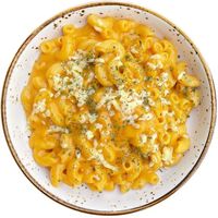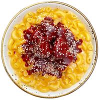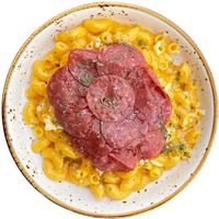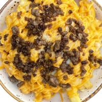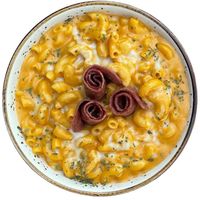 Creamy macaroni and cheese topped with savory, tender beef for a rich, indulgent experience.