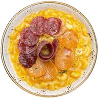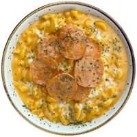 Creamy mac and cheese topped with savory chicken pepperoni for a delightful twist on a classic.