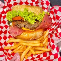 Beef patty, cheddar, streaky beef, grilled onion, tomato, salad & special sauce