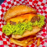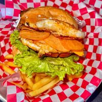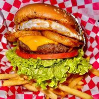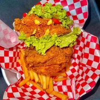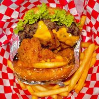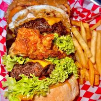 Beef patty cheddar, chicken, salad, grilled onion, tomato & special sauce