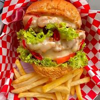 Beef patty, cheddar, chicken, salad, grilled onion, tomato, special sauce, nachos sauce served with fries & beverage