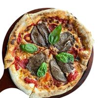 Wagyu Beef Tenderloin, special tomato sauce, beef pepperoni, onion and mozarella cheese