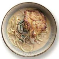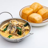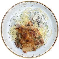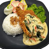 Spaghetti with spicy creamy salted egg sauce with fried chicken chop & curry leave