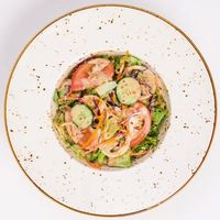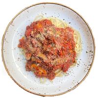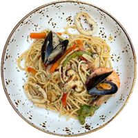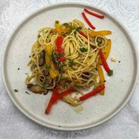 Spaghetti with chili flakes, shitake mushroom, capsicum, calamari, prawn & mussel