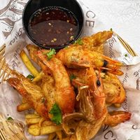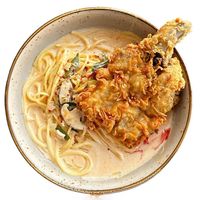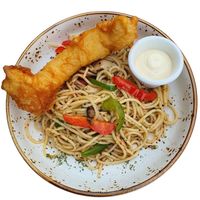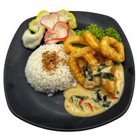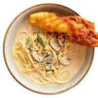 Spaghetti with spicy creamy salted egg sauce with tempura fish & curry leave