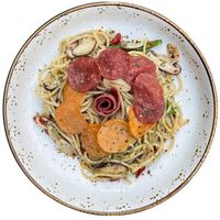 Spaghetti aglio olio with chicken salami, steaky beef & beef pepperoni