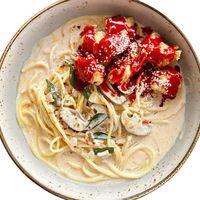 Spaghetti with spicy creamy salted egg sauce with gochujang chicken & curry leave