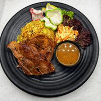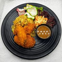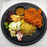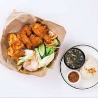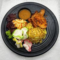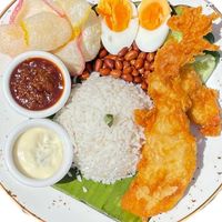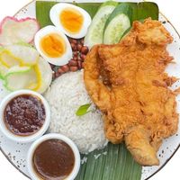 Nasi lemak, sambal, peanut, cucumber & fried chicken