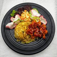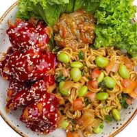 Indomee gochujang chicken, sambal gesek, green coral & edamame