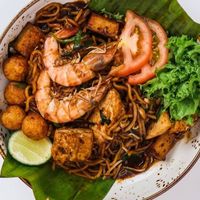 Mee goreng, taugeh, kucai, fish ball, fish cake, prawn & chicken slice