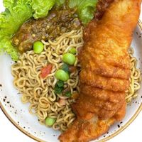 Indomee fish tempura, sambal gesek, green coral & edamame