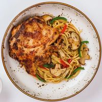 Spaghetti with chili falkes, shitake mushroom, cherry tomatoes & grilled chicken
