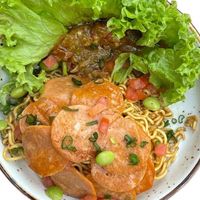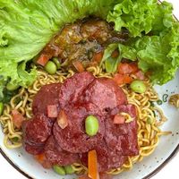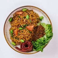Indomee beef, chicken pepperoni, sambal gesek, green coral & edamame