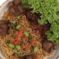 Indomee streaky beef, sambal gesek, green coral & edamame