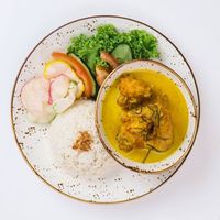 Nasi putih, kuah masak sambal, timun, tomato, salad & keropok